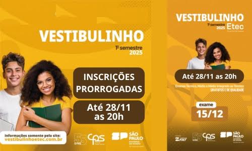 O período de inscrições para o Vestibulinho das Escolas Técnicas Estaduais (Etecs) do Centro Paula Souza (CPS) foi prorrogado até as 20 horas de quinta-feira (28). O interessado em conquistar uma vaga para o primeiro semestre de 2025 deve se candidatar pelo site vestibulinhoetec.com.br. Também é necessário realizar o pagamento da taxa de inscrição de R$ 39,85, até o fim do novo prazo. Prova será no dia 15 de dezembro.