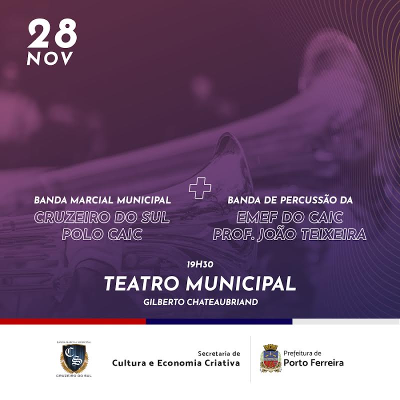 A Banda Marcial Municipal Cruzeiro do Sul (Polo do Caic) e a Banda de Percussão da Emef do Caic Professor João Teixeira convidam a comunidade para sua emocionante apresentação de fim de ano, que será realizada nesta quinta-feira (28/11), a partir das 19h30.