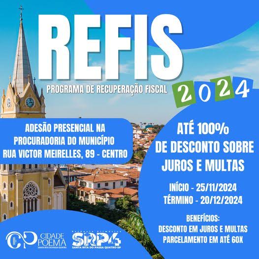 A Prefeitura de Santa Rita do Passa Quatro abriu uma super oportunidade para você regularizar seus débitos com condições imperdíveis. O Refis 2024 oferece descontos especiais de até 100% nas multas e juros, além de possibilitar o parcelamento de até 60 vezes.