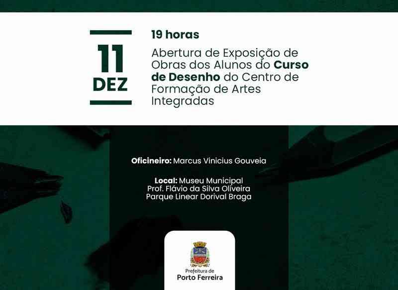 O Museu Municipal Professor Flávio da Silva Oliveira, situado no Parque Linear Dorival Braga, no Centro, receberá a exposição de arte dos alunos do Curso de Desenho do Centro Municipal de Formação de Artes Integradas, vinculado à Secretaria de Cultura e Economia Criativa de Porto Ferreira.