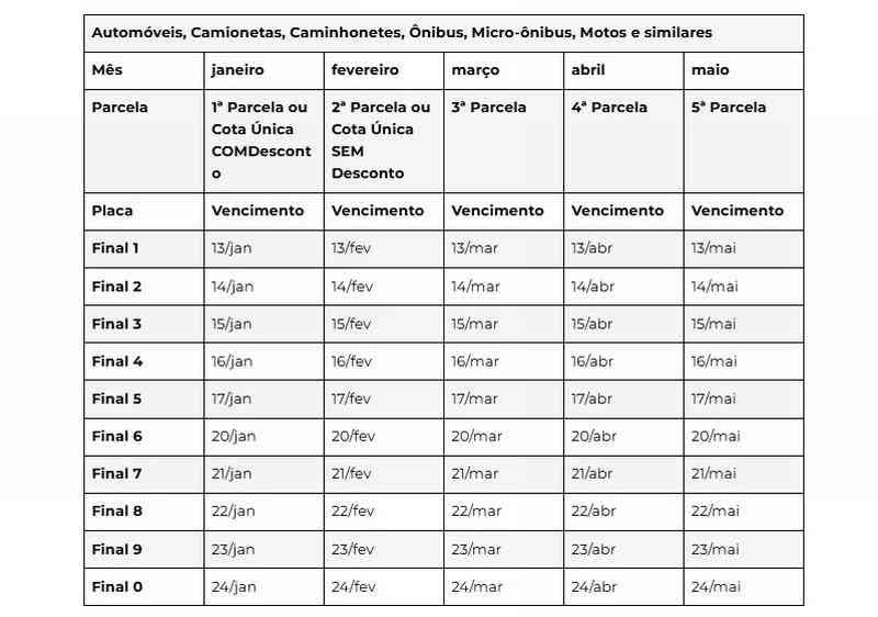 O proprietário tem até a data de vencimento da placa (veja tabela) para quitar o imposto. Em janeiro, é possível antecipar o pagamento em cota única, com desconto de 3% – essa opção é atrativa, pois apresenta um rendimento maior que o da poupança, por exemplo. Também em janeiro é a data para quem decidir pagar tributo parcelado, devendo recolher a primeira parcela. É possível pagar o imposto em até cinco vezes.*