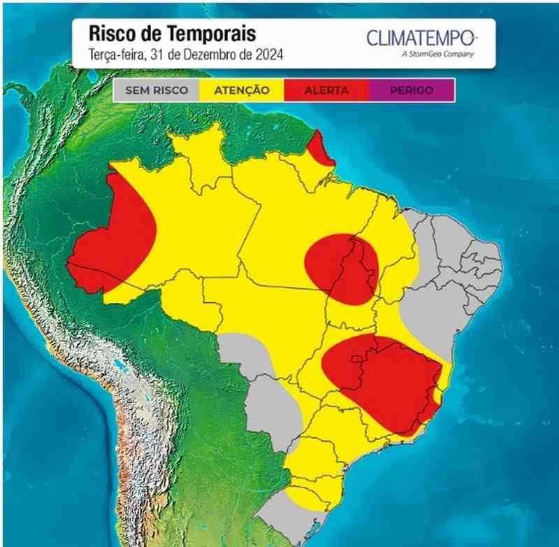 A Climatempo alerta para o risco de temporais (áreas em vermelho no mapa) no oeste do Amazonas e do Acre, no norte e litoral do Amapá, no centro e norte do Tocantins, no sudeste do Pará e extremo sul do maranhão. Também tem alerta para temporais nesta terça, 31 de dezembro de 2024, para a região do Distrito Federal e todo o centro e leste de Goiás, para a Grande Belo Horizonte e quase todo o estado de minas Gerais, na região serrana do Rio de Janeiro e no Noroeste Fluminense, na Grande Vitória e no interior do Espírito Santo.