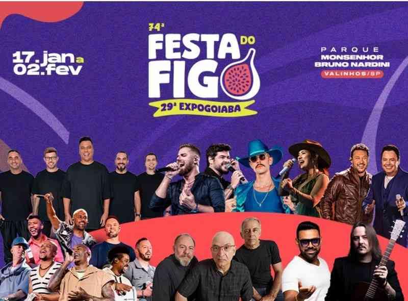 11 artistas em nove dias de festa estarão se apresentando no palco principal da 74ª Festa do Figo e 29ª Expogoiaba da cidade de Valinhos, interior do Estado de São Paulo, que vai acontecer entre os dias 17 de janeiro e 02 de fevereiro de 2025. O evento promete agitar a população valinhense e de toda a Região Metropolitana de Campinas. A festa, que vai acontecer no Parque Monsenhor Bruno Nardini, conta com o apoio da Prefeitura Municipal de Valinhos, e tem a realização da Organização Estrela, uma das maiores empresas de entretenimento do Estado de São Paulo.