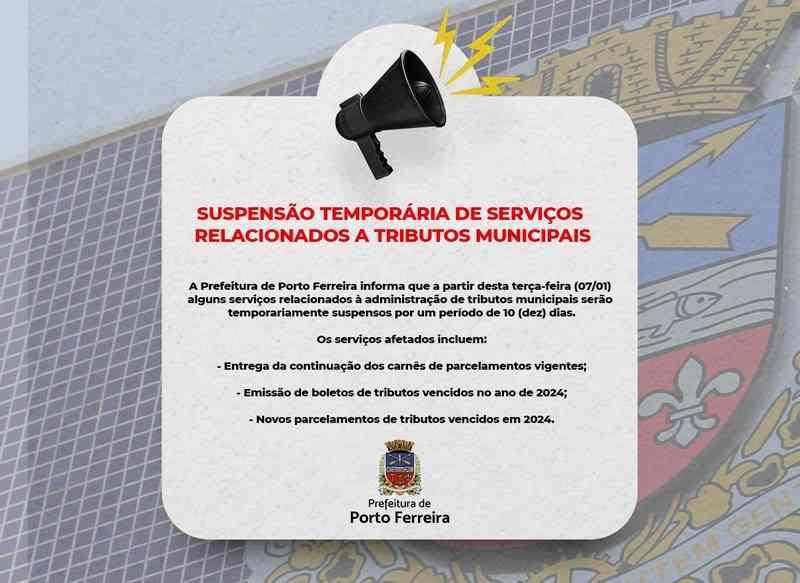 A Prefeitura de Porto Ferreira informa que a partir desta terça-feira (07/01) alguns serviços relacionados à administração de tributos municipais serão temporariamente suspensos por um período de 10 (dez) dias. Os serviços afetados incluem: