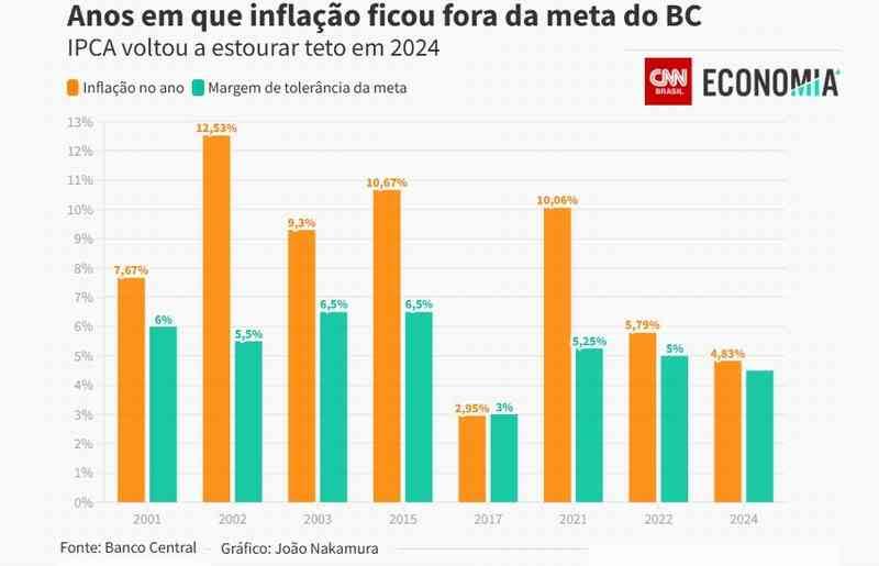 A meta estabelecida pelo Conselho Monetário Nacional (CMN) e a ser perseguida em 2024 pelo Banco Central (BC) era de inflação a 3%, com margem de tolerância de 1,5% — ou seja, até 4,5%, foi de 4,83%