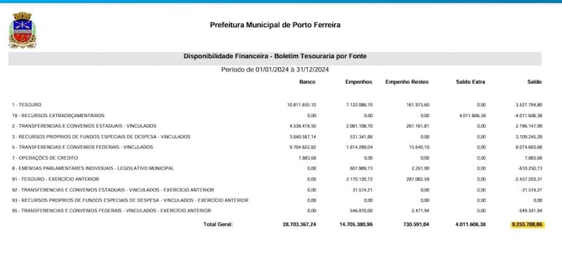 O ex-prefeito de Porto Ferreira, Rômulo Rippa, divulgou em suas redes sociais os dados referentes ao saldo financeiro da Prefeitura em 31 de dezembro de 2024, último dia de sua gestão. De acordo com as informações, os cofres municipais encerraram o ano com uma disponibilidade financeira de R$ 28,7 milhões, dos quais R$ 15,4 milhões estão vinculados a despesas e contratos empenhados, e R$ 4 milhões são recursos extraorçamentários. O resultado final apontou um superávit financeiro de R$ 9 milhões, ou seja, recursos livres de quaisquer compromissos financeiros.