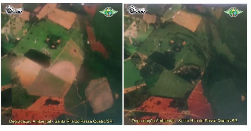 Policiais do 4º Batalhão de Polícia Militar Ambiental autuaram proprietária rural por destruir vegetação nativa em Santa Rita do Passa Quatro/SP. Através de comparação de imagens geradas via satélite (clique para ver a animação), foi possível verificar que a responsável pela área destruiu 5,71 hectares de vegetação nativa.