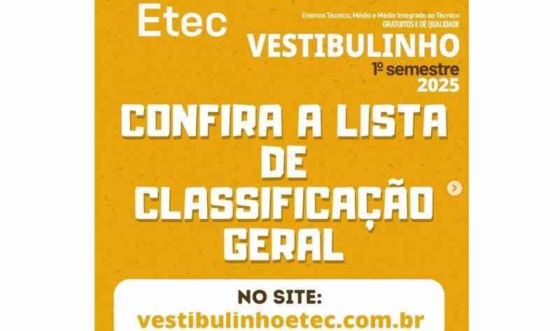 Desde ontem, segunda-feira(13/01), é possível consultar a classificação geral do processo seletivo das Escolas Técnicas Estaduais (Etecs) para o primeiro semestre de 2025, pelo site vestibulinhoetec.com.br. A relação traz o nome de todos os inscritos nos cursos técnicos, Ensino Médio, Ensino Médio Integrado ao Técnico, Articulação da Formação Profissional Média e Superior (AMS) e Especialização Técnica – incluindo os que fizeram a prova de aptidão para Canto, Dança, Teatro e Especialização Técnica em Danças a Dois.
