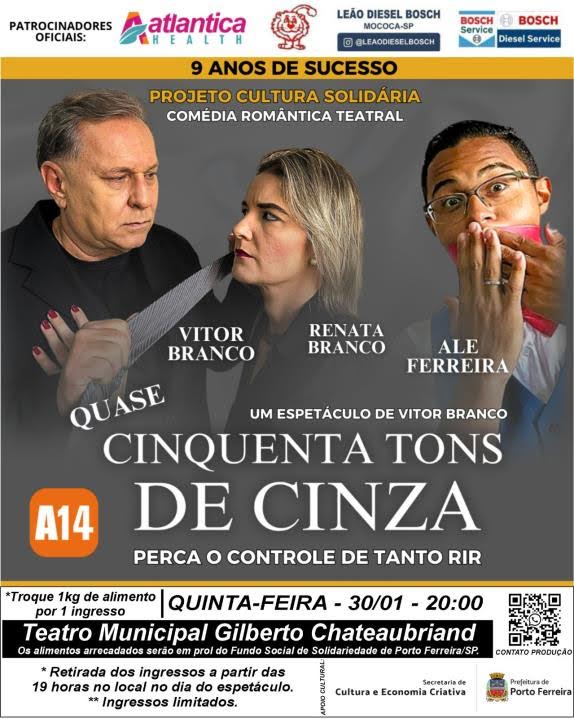 O Teatro Municipal Gilberto Chateaubriand, em Porto Ferreira, será palco de uma divertida comédia romântica no próximo dia 30 de janeiro, a partir das 20h. Com 9 anos de sucesso, o espetáculo "Quase Cinquenta Tons de Cinza", de Vitor Branco, traz no elenco Vitor Branco, Renata Branco e Ale Ferreira, prometendo boas risadas e momentos de descontração para o público.