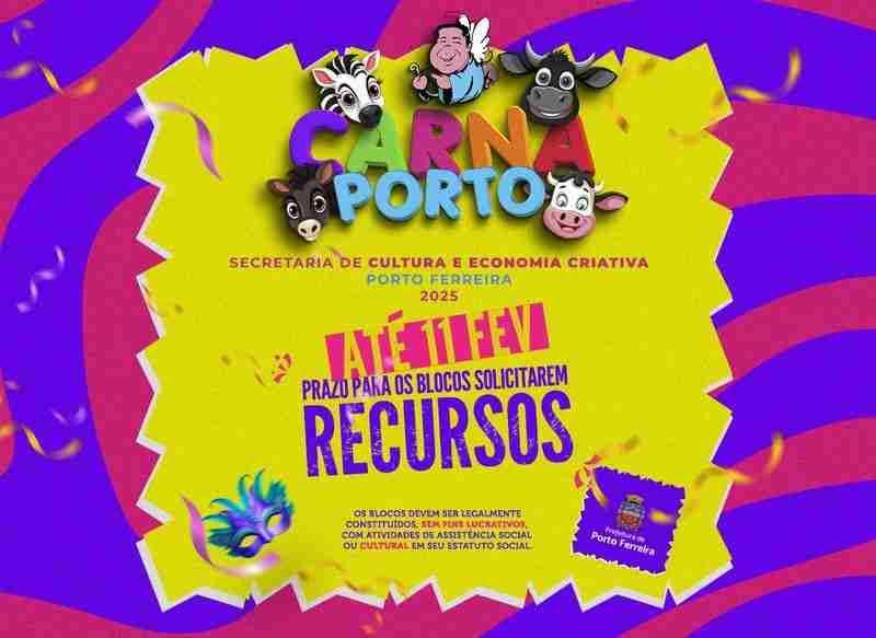 A Secretaria de Cultura e Economia Criativa de Porto Ferreira anunciou a abertura do período para solicitação de recursos destinados aos blocos carnavalescos que desejam participar do Carnaval 2025. Os interessados têm até o dia 11 de fevereiro para protocolar seus pedidos, seguindo as diretrizes estabelecidas pela legislação municipal.