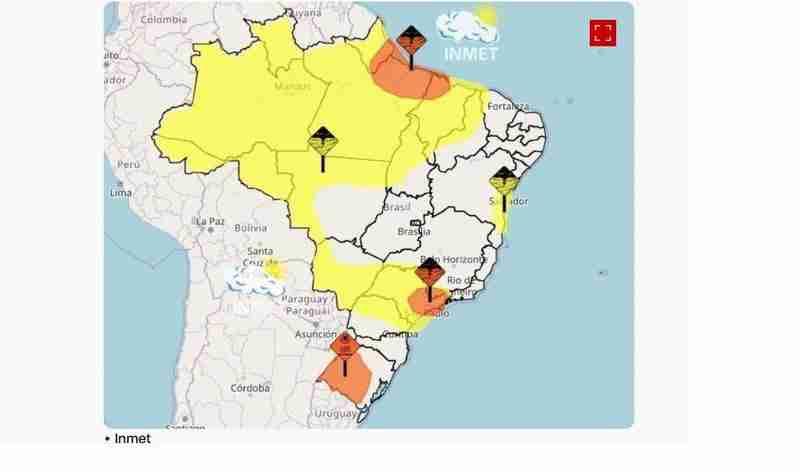 • Alerta de perigo potencial: estados de São Paulo, Paraná, Mato Grosso do Sul, Mato Grosso, Rondônia, Acre, Amazonas, Roraima, Pará, Amapá, Tocantins, Maranhão e Piauí