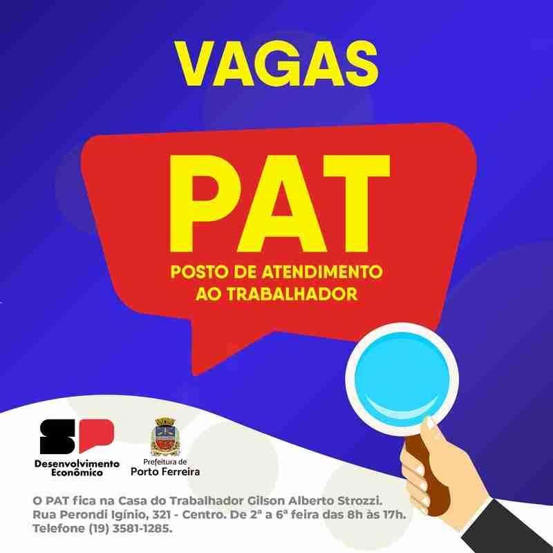PAT de Porto Ferreira anuncia algumas vagas de trabalho nesta sext-feira (21/02/2025). O Pat de Porto Ferreira está localizado à Rua Perondi Ignio nº 321- Centro. Telefones: (19) 3581-1285, ou 3585-4857, ou 3585-4225, ou 3585-2835.
