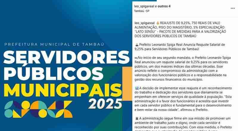 No início de seu segundo mandato, o Prefeito Leonardo Spiga Real presenteou os servidores públicos de Tambaú com uma notícia que ecoou positivamente pela cidade: um reajuste salarial de 9,25%, um dos maiores índices das últimas décadas. A medida, que demonstra o compromisso da administração com a valorização dos funcionários públicos e a responsabilidade na gestão dos recursos municipais, foi recebida com entusiasmo pela categoria.