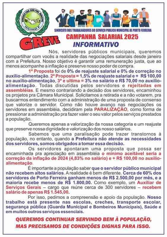 Informativo do Sindicato dos Trabalhadores do Serviço Público Municipal de Porto Ferreira – Greve a partir de 1º de Abril