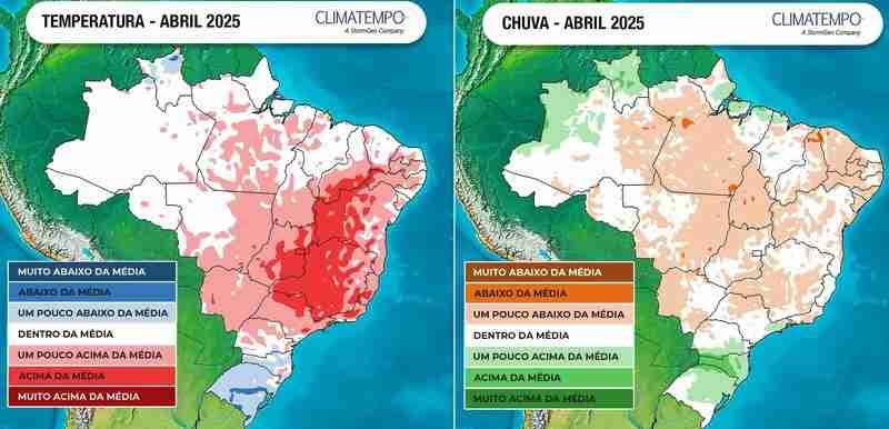 O mês de abril traz as primeiras massas de ar frio de origem polar continentais, que vão conseguir resfriar algumas áreas do Brasil. As duas massas polares mais impactantes vão acontecer no final da primeira quinzena de abril e no final do mês. Ainda assim, o que vai predominar em abril ainda serão os dias quentes. Os períodos com temperatura baixa/amena serão curtos no centro-sul do Brasil e a previsão é de que abril termine com temperaturas acima da média na maior parte do país. Abril deve terminar com temperatura um pouco abaixo da média no Rio Grande do Sul e em Santa Catarina.