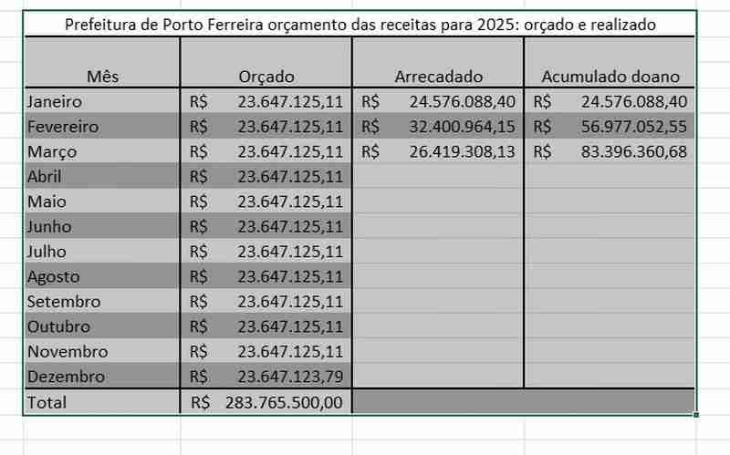 A Prefeitura de Porto Ferreira encerrou o primeiro trimestre de 2025 com um desempenho financeiro notável, registrando uma arrecadação de R$ 83.396.360,68. Esse valor representa um superávit de 15% em relação ao montante orçado para o período, que era de R$ 70.941.375,33, conforme estabelecido pela Lei Orçamentária Anual (LOA) nº 3.809/24.