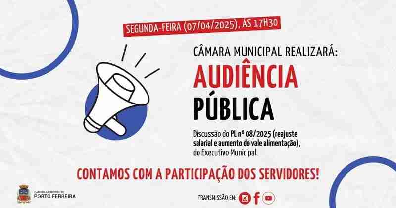 A Câmara Municipal de Porto Ferreira, após convocação de seu presidente, vereador Alan João (PSB), realizará audiência pública para a discussão do Projeto de Lei nº 08/2025, que concede revisão geral anual da remuneração aos servidores da administração direta e autárquica do município de Porto Ferreira, bem como aumenta o valor do auxílio alimentação previsto na Lei Municipal nº 3.642/2021, na próxima segunda-feira (07/04), às 17h30, em seu Plenário (avenida Engenheiro Nicolau de Vergueiro Forjaz, 1068).