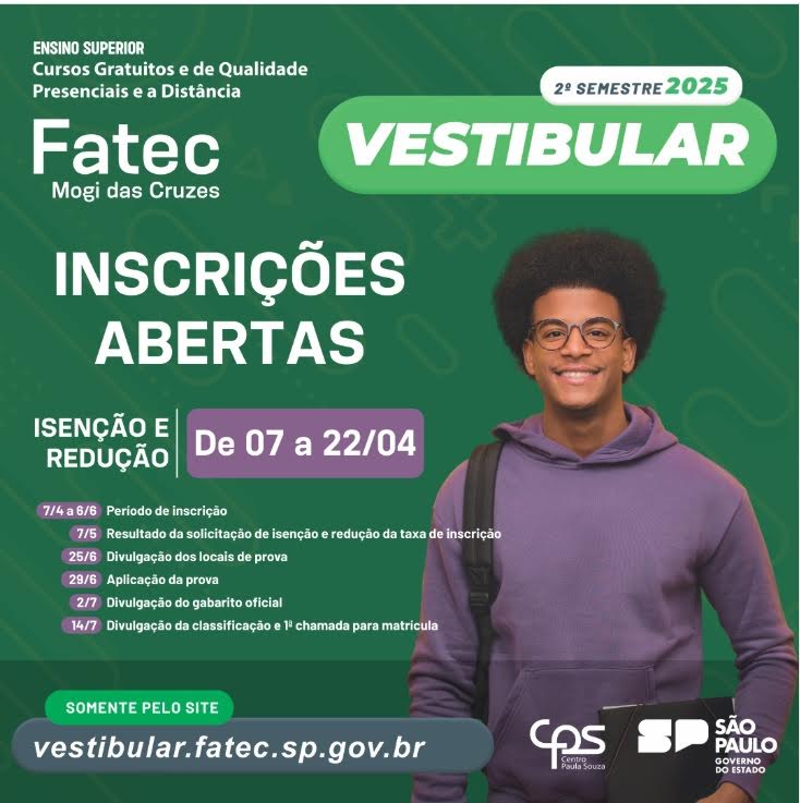 As Fatecs – do Centro Paula Souza estão com as inscrições abertas para o vestibular de meio de ano de 2025. As inscrições podem ser realizadas no site da Fatec até às 15h do dia 6 de junho. Para se inscrever, o candidato deve ter concluído o ensino médio e realizar o pagamento da taxa. O valor da taxa de inscrição é de R$ 50.