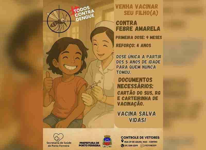 A Prefeitura de Porto Ferreira, por meio da Secretaria de Saúde, está reforçando o chamado para que pais e responsáveis levem seus filhos para tomar a vacina contra a febre amarela. A imunização é fundamental para a prevenção da doença e faz parte das ações integradas de combate ao mosquito transmissor, o mesmo que transmite a dengue, zika e chikungunya.