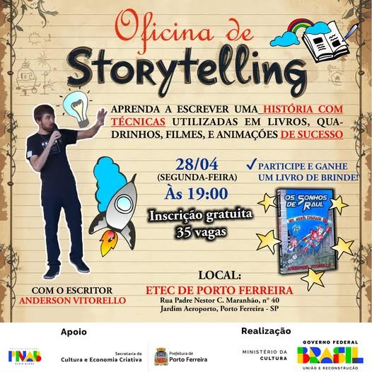 Você já se perguntou por que algumas histórias nos prendem da primeira à última página? Os segredos por trás desse poder de fascínio serão revelados por Anderson Vitorello em uma oficina presencial de Storytelling, que acontecerá em Porto Ferreira, na próxima quinta-feira, dia 28/04, a partir das 19h – na Etec Professor Jadyr Salles – localizada à avenida Padre Nestor Maranhão, antigo prédio da Asser/Unicep, nº 40.
