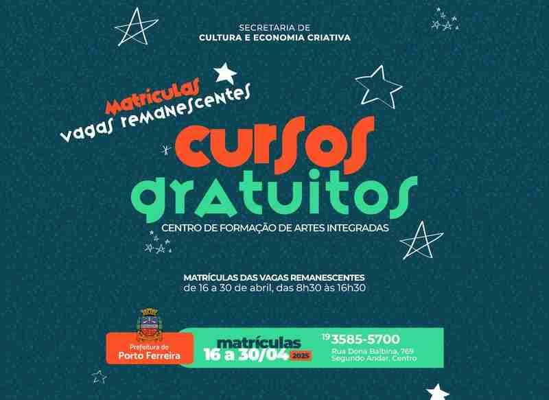 A Secretaria de Cultura e Economia Criativa da Prefeitura de Porto Ferreira anuncia as vagas remanescentes para os cursos do Centro de Formação de Artes Integradas. As matrículas serão de 16 a 30 de abril, das 8h30 às 16h30, na sede da Secretaria, localizada na rua Dona Balbina, 769, 2º andar, no Centro.