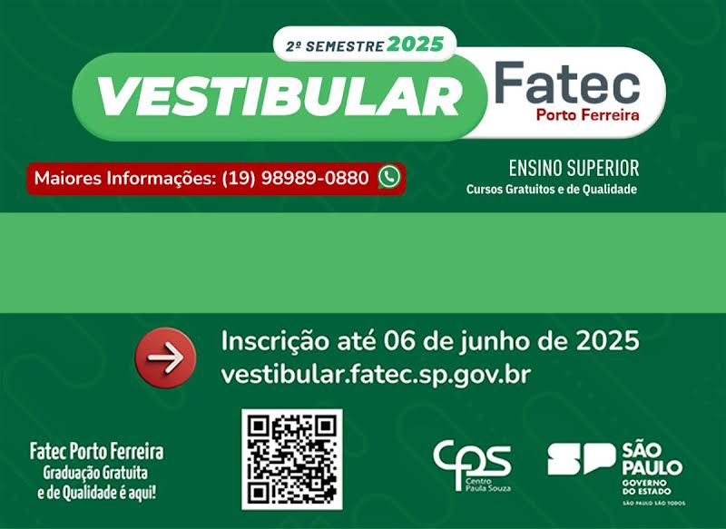 Estão abertas as inscrições para o vestibular da Fatec de Porto Ferreira para o segundo semestre de 2025 até as 15 horas do próximo dia 6 de junho. Os cursos superiores gratuitos oferecidos pela unidade são: Desenvolvimento de Software Multiplataforma e Logística. Ambos terão turmas no período noturno, com 25 vagas e duração de 3 anos em cada curso.