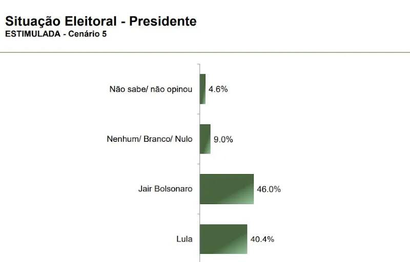 Bolsonaro, a príncipio ainda inelegível, lidera, com 38,5%, contra 33,3% do petista. Em terceiro lugar aparece Ciro Gomes, do PDT, com 9,7%, seguido pelo governador de Goiás, Ronaldo Caiado, do União Brasil, com 3,6%. Em quinto lugar aparece o governador do Rio Grande do Sul, Eduardo Leite (PSDB), com 2,9%, e por fim, em sexto, o governador do Pará, Helder Barbalho (MDB), com 1%. Os que não sabem ou não opinaram somam 4,2%, enquanto os que não votariam em nenhum deles ou anularia o voto são 7%.