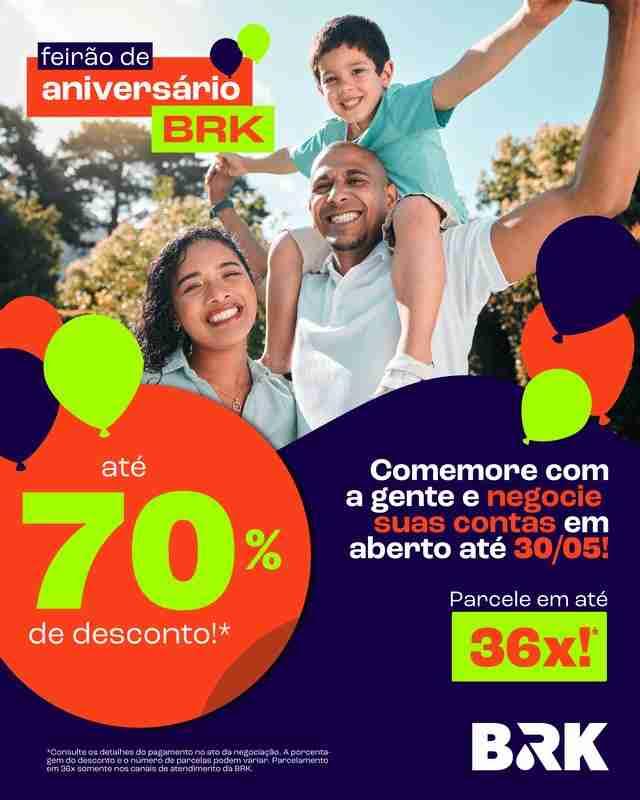 O Feirão de Aniversário BRK oferece desconto de até 70% para pagamento à vista e opções de parcelamentos. Nos canais de atendimento da BRK, as negociações permitem pagamento em até 36 vezes. No cartão de crédito, os parcelamentos podem ocorrer em até 21 vezes, com negociações na agência virtual Minha BRK ou em sites parceiros: Serasa Limpa Nome e Flexpag.