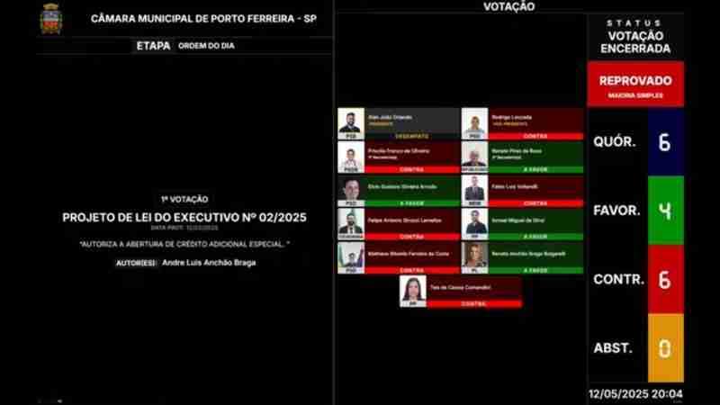 Na sessão ordinária desta segunda-feira (12/05), a Câmara Municipal de Porto Ferreira rejeitou, por seis votos a quatro, o Projeto de Lei nº 02/2025, enviado pelo Executivo, que autorizava a abertura de um crédito adicional de R$ 500 mil para a construção de um muro de arrimo na sede da Secretaria de Segurança e Mobilidade Urbana.