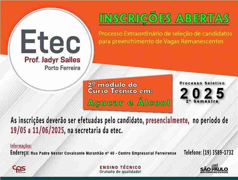 A ETEC Professor Jadyr Salles, localizada em Porto Ferreira (SP), está com inscrições abertas para vagas remanescentes em dois de seus cursos técnicos presenciais: o 1º ano do Curso Técnico em Informática e o 2º módulo do Curso Técnico em Açúcar e Álcool.