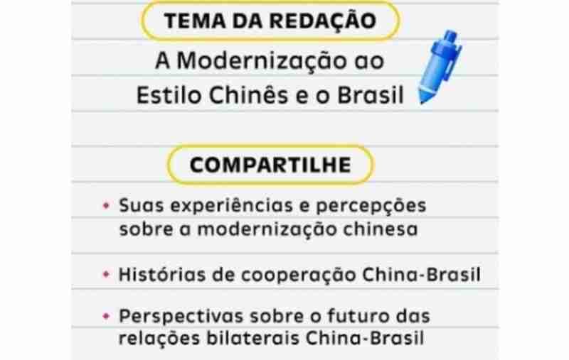 A redação deve abordar um ou mais dos seguintes tópicos: experiências pessoais relacionadas à modernização chinesa, histórias de cooperação entre os dois países e as oportunidades futuras nas relações bilaterais. Além do texto, é necessário apresentar uma Declaração de Originalidade assinada e digitalizada.