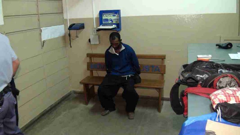 Na busca pessoal os policiais localizaram no bolso do indiciado uma faca tipo de uso doméstico e uma chave de fenda. Em uma bolsa escolar foram localizados: um cd player automotivo, dois óculos de sol, uma jaqueta e um pen drive.