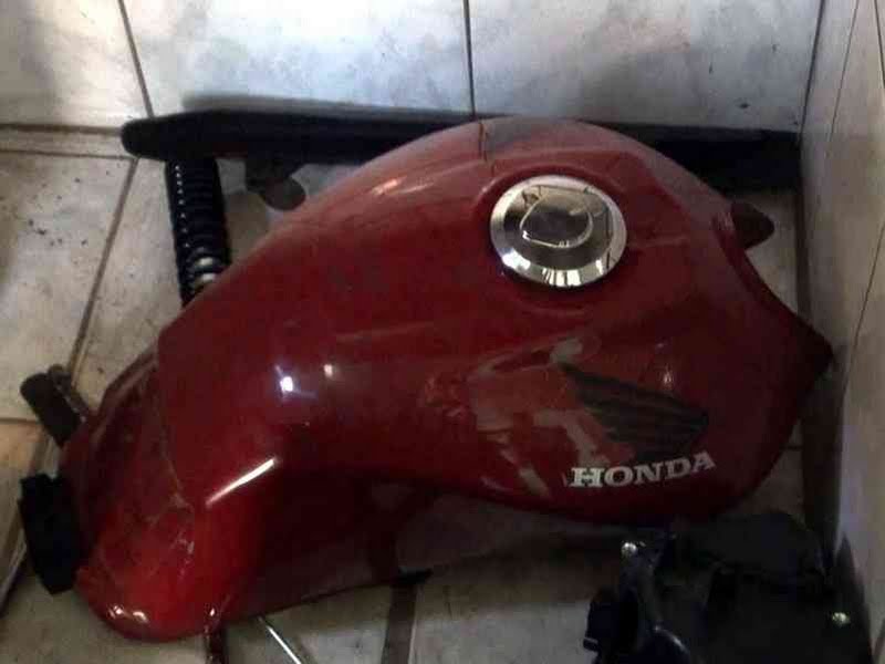 Nas buscas realizadas na casa, os policiais encontraram sob a cama de outro desocupado de 22 anos diversas peças de motos, entre elas um tanque e carenagem de uma moto.