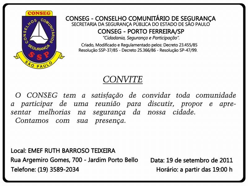 O CONSEG – Conselho Comunitário de Segurança convida todos os interessados para a reunião sobre Segurança, a qual será realizada no dia 19 de setembro, a partir das 19h00, na EMEF Ruth Barroso Teixeira, localizada à Rua Argemiro Gomes nº 700, Jardim Porto Bello.