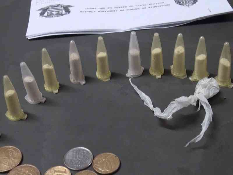 No recipiente que ele havia jogado foram localizadas treze cápsulas aparentando conter cocaína e mais oito pedras aparentando ser crack.