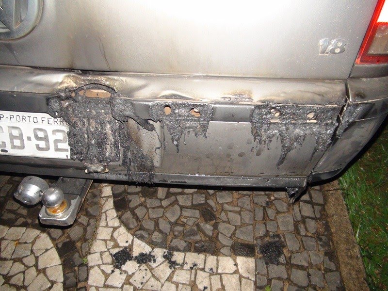 Foram localizadas próximo ao veículo, duas garrafas plásticas tipo Pet, nas quais continham em seu interior gasolina, com isso ficou claro que o incêndio ocorreu de forma criminosa.