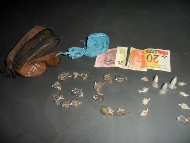 Vistoriando o terreno os patrulheiros municipais localizaram uma pochete contendo em seu interior 15 porções de maconha, 7 pedras de crack, 3 pinos de cocaína e R$ 30,00 em espécie.
