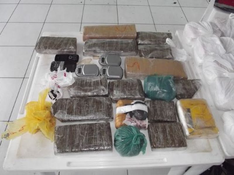 Ao todo foram apreendidos 15,35 kg de cocaína em 30 pacotes; 1,2 kg de cocaína (na residência do autuado), 1,95 kg de crack (em 53 sacos plásticos) e 6, 96 kg de maconha (em 26 tabletes). Um total de 25,477 kg de droga apreendidas.