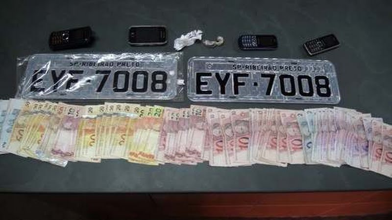 Na abordagem realizada por volta das 16 horas na rua Anésio Tofoli, os policiais localizaram no bolso de um deles a quantia de R$ 1.125,00 em notas diversas e em busca realizada dentro do carro foi localizado sob o tapete do passageiro um par de placas novas de veículo da cidade Ribeirão Preto-SP. No porta luvas do carro os policiais encontraram ainda uma porção de maconha.