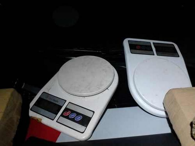 vazios usados para acondicionar entorpecente para a venda e duas balanças de precisão.