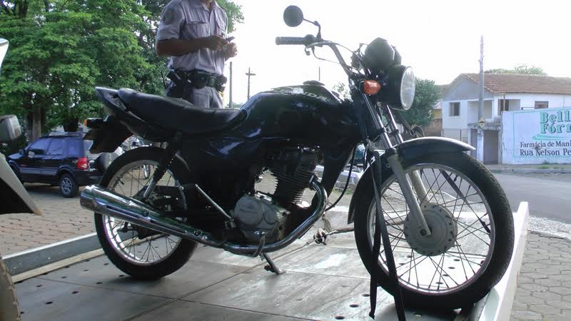 Os policiais desembarcaram da viatura e foram atrás do indivíduo, localizando no corredor da casa uma moto CG 125 TITAN FAN KS, com a Placa BVH-3791, mas com os números do chassi e motor raspados. Pesquisa da placa realizada pelo Sistema Prodesp constou que a mesma era de uma moto Yamaha DT, cor preta. Dentro da casa os policiais localizaram ainda duas porções de maconha, um pino com cocaína e uma espingarda de pressão marca Rossi.