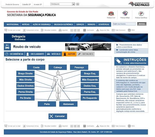 O registro da ocorrência de roubo pela web depende do preenchimento correto de um formulário disponível no site da Delegacia Eletrônica. Além de informações pessoais da vítima, são pedidos dados como local onde o roubo ocorreu, características do veículo e do autor do crime.
