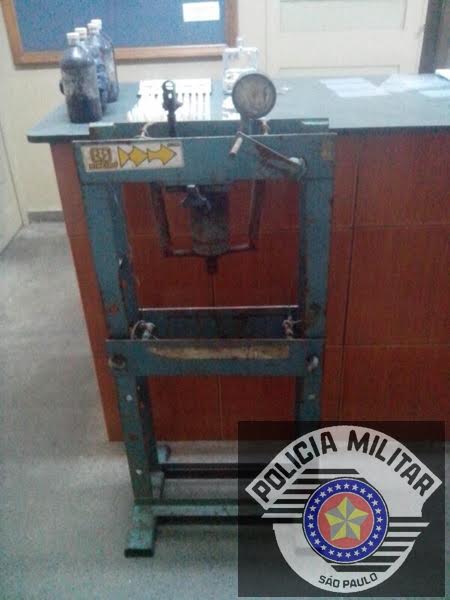 Em buscas efetuadas no local, os policiais localizaram por volta das 21 horas: uma prensa utilizada para prensar tijolos de entorpecentes, 04 litros de éter, 134 eppendorfs com cocaína, 100 trouxinhas com maconha embaladas e prontas para a venda e 545 pedras de crack. Em uma sacola escondida na base de uma árvore foram localizados várias joias e relógios, todos produtos de furto de uma casa em data anterior.