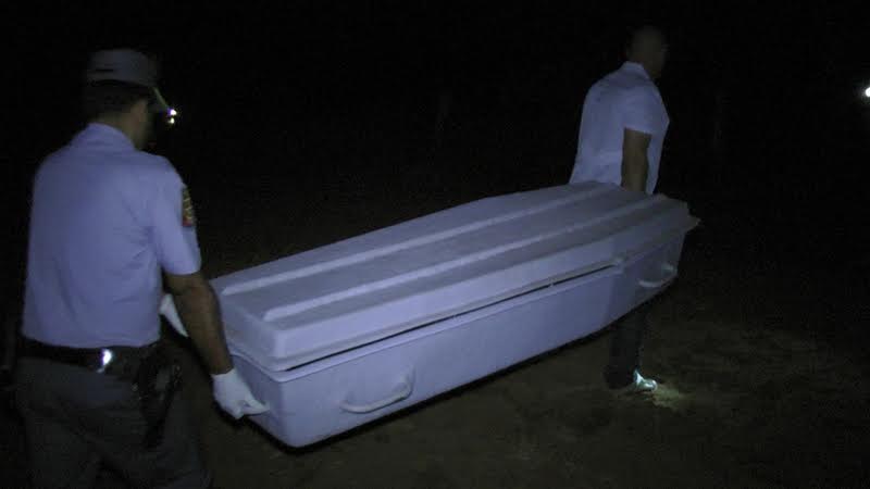 O corpo já estava em estado avançado de decomposição, sendo possível notar apenas partes do corpo como: ossos do peito, costela, ossos das pernas, pés e uma das mãos. Não foi localizado o crânio.