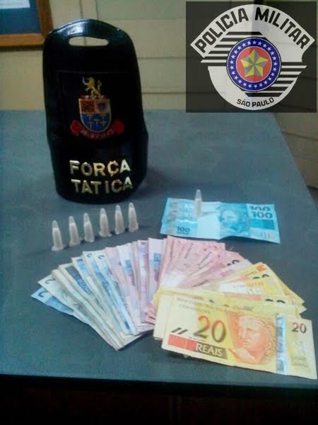 No momento da abordagem o menor ainda jogou seis pinos com cocaína em um terreno ao lado de onde estava. Em revista minuciosa, os policiais ainda localizaram com ele uma certa quantia em dinheiro (R$ 450,00), que disse ser proveniente do tráfico.