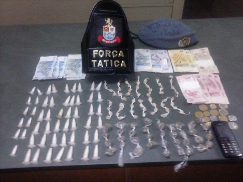 Com a dupla, os policiais localizaram 36 porções de maconha, 56 pedras de crack e 53 pinos com cocaína.