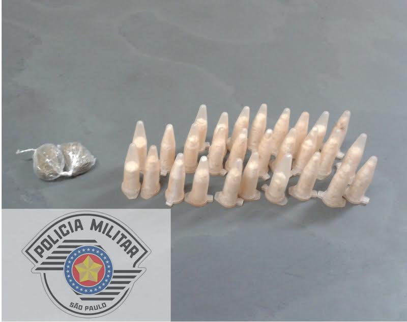 Após o recebimento de denúncia anônima pelo telefone 190 informando da ocorrência de tráfico de drogas pela rua Albino M. Peres, Jardim Anésia II, os soldados PMs Fernando e Brian, da ROCAM (rondas ostensivas com apoio de motocicletas), realizaram por valta das 14h30 de terça-feira (25/03) a abordagem de um desempregado de 25 anos e de um menor de 15 anos, com eles encontrando vinte e oito pinos com cocaína e duas trouxinhas com maconha, embalados e prontos para a venda.