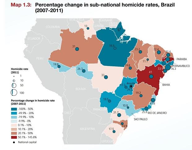 O estudo, realizado pelo Escritório das Nações Unidas sobre Drogas e Crime, também destaca que os homicídios em São Paulo caíram 11% entre 2007 e 2011, enquanto cresceram 150% na Paraíba e 50% na Bahia.