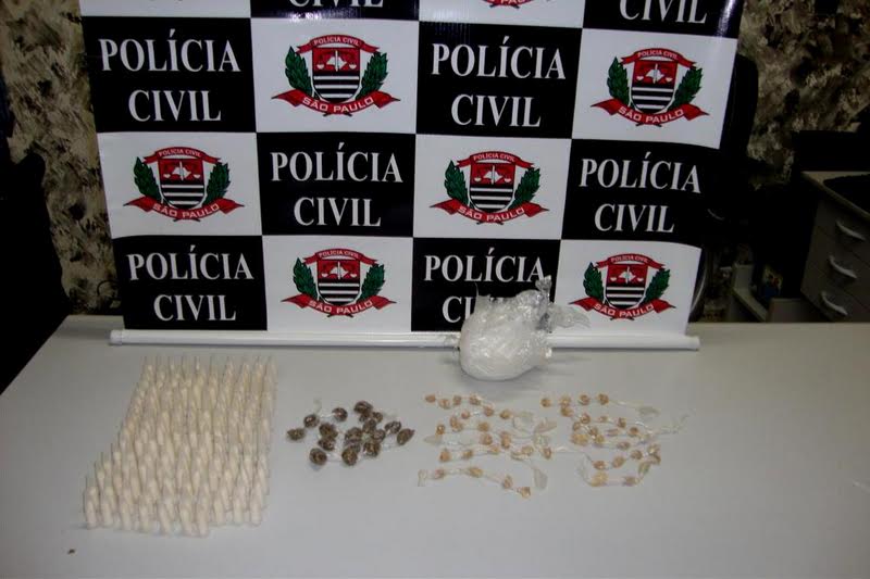 Em diligência realizada no Jardim Paschoal Salzano, decorrente de informações recebidas de prática de tráfico de drogas, foram apreendidos 147 pinos com cocaína, pesando 266 gramas; 48 pedras de crack, pesando 21 gramas; e 16 trouxinhas de maconha, pesando 12 gramas, As investigações prosseguem a fim de identificação do proprietário das drogas apreendidas.