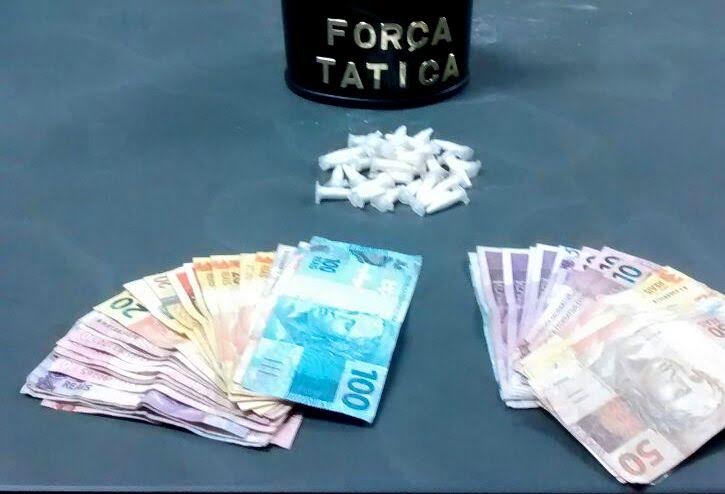 Os mesmos foram abordados por volta das 2 horas, tratando-se de serventes de pedreiro moradores no bairro Porto Bello I, um com 28 anos e outro com 19 anos de idade. Em revista pessoal foi localizada com o condutor uma certa quantia em dinheiro e escondido na carenagem da moto uma sacola plástica contendo 33 eppendorfs com cocaína. Com o passageiro foi localizada uma certa quantia em dinheiro em notas fracionadas.